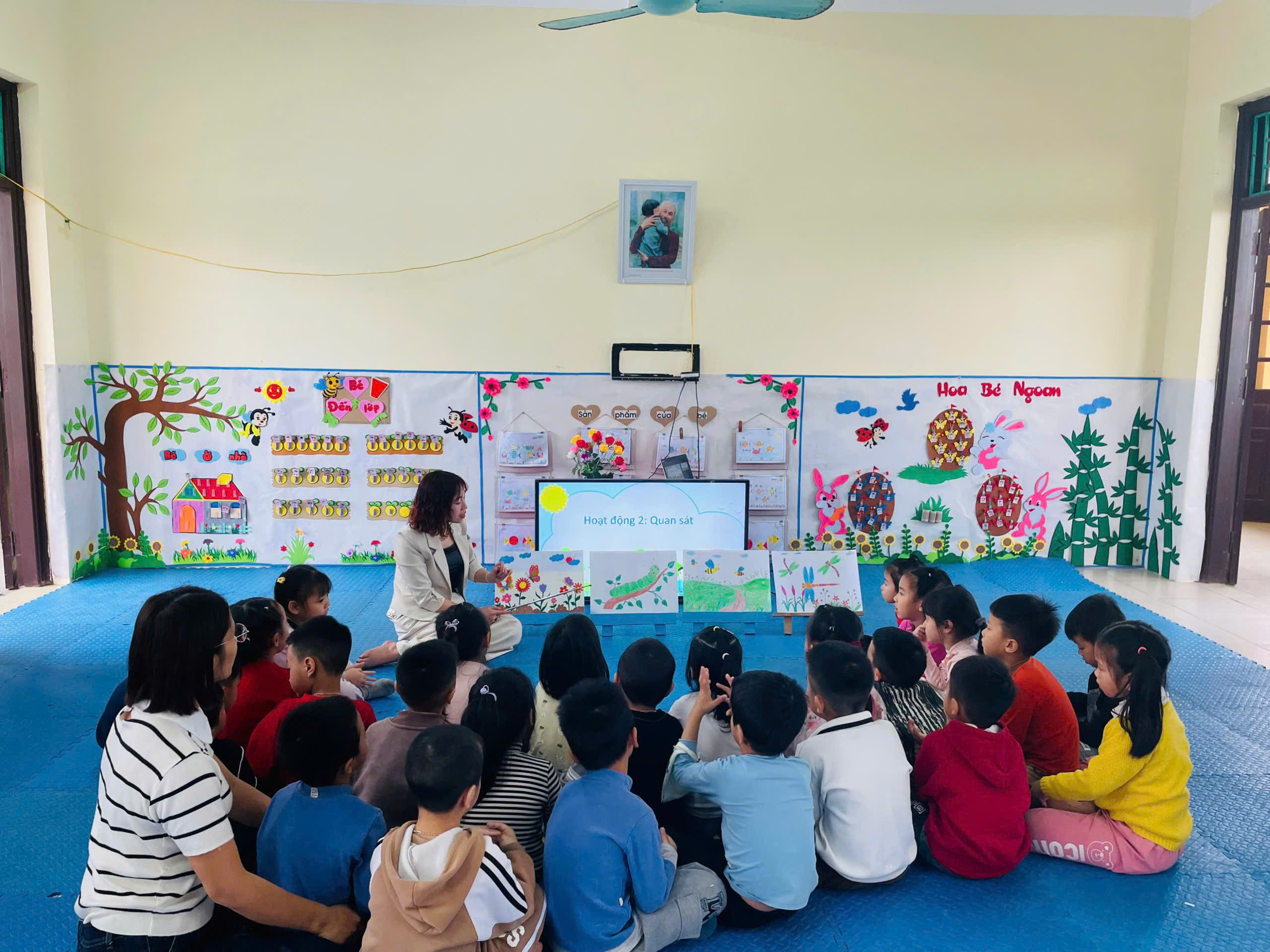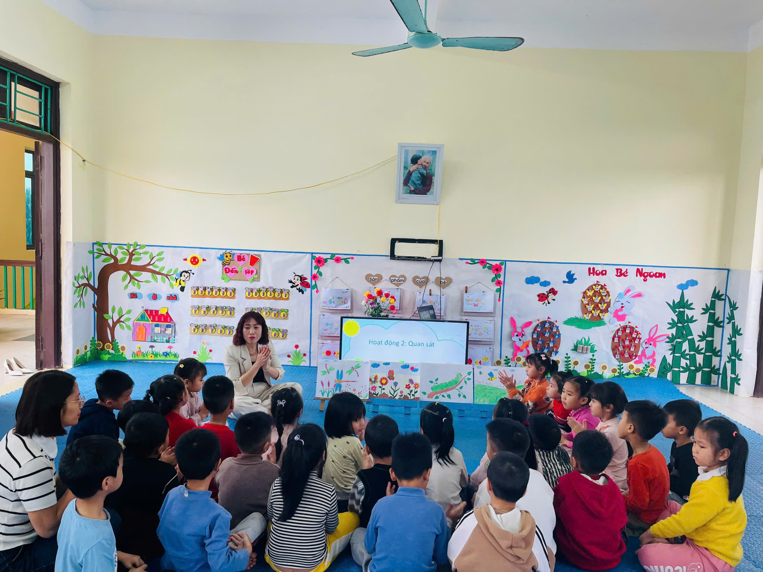 Hoạt động được tổ chức sinh động, khoa học, phù hợp với đặc điểm tâm sinh lý lứa tuổi mầm non. Ngay từ phần khởi động, giai điệu vui tươi của bài hát “Con bướm vàng” đã giúp trẻ nhanh chóng hòa nhập, tạo tâm thế hứng khởi trước khi bước vào nội dung tạo hình. Trẻ được quan sát, trò chuyện về hình dáng, màu sắc, đặc điểm của một số loài côn trùng quen thuộc như bướm, ong, chuồn chuồn…, từ đó phát triển khả năng quan sát, tư duy và ngôn ngữ.