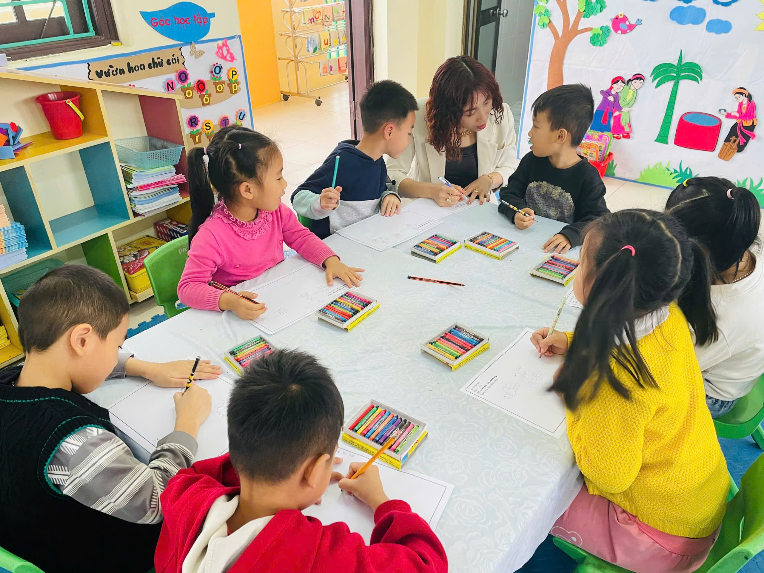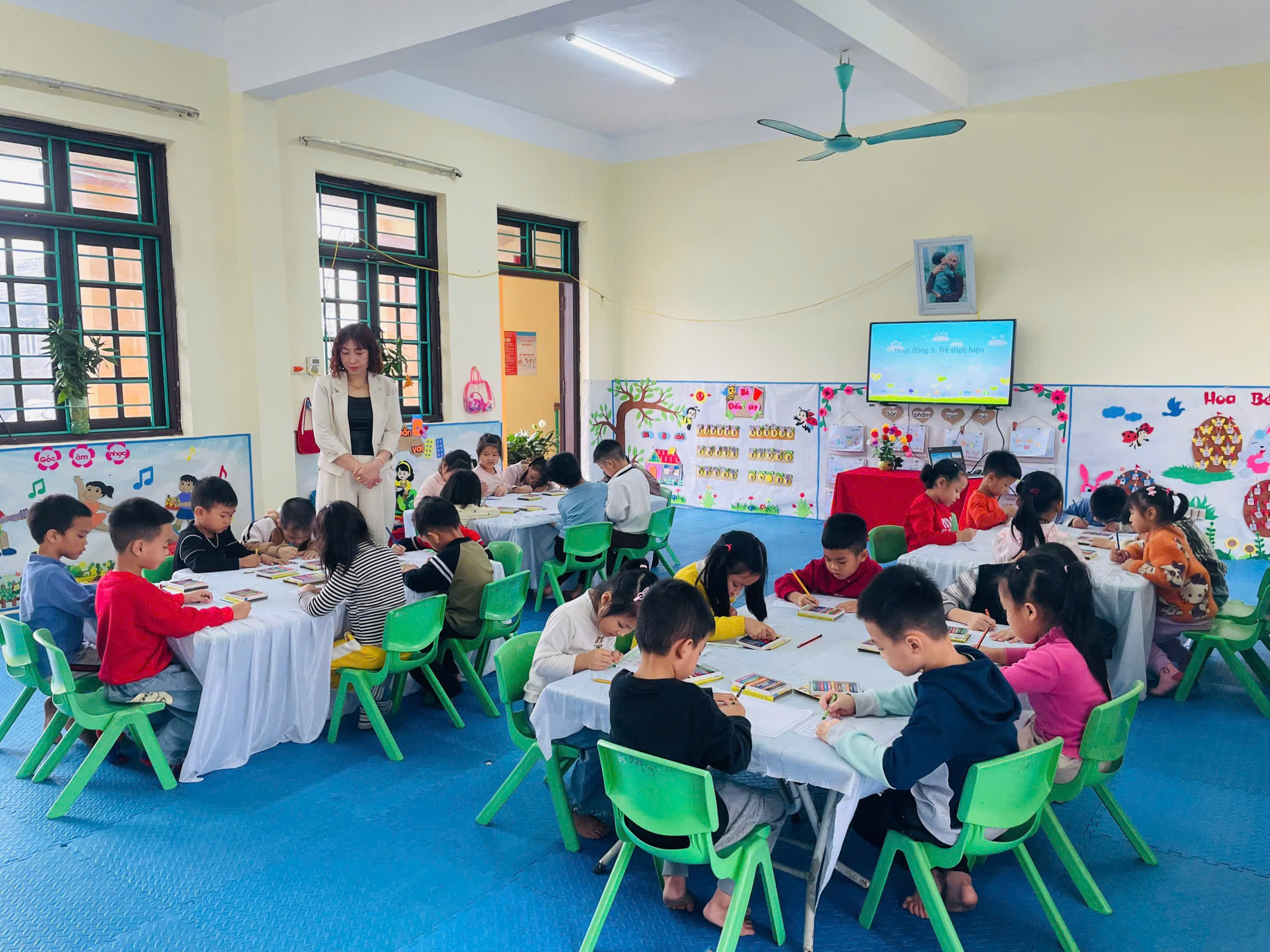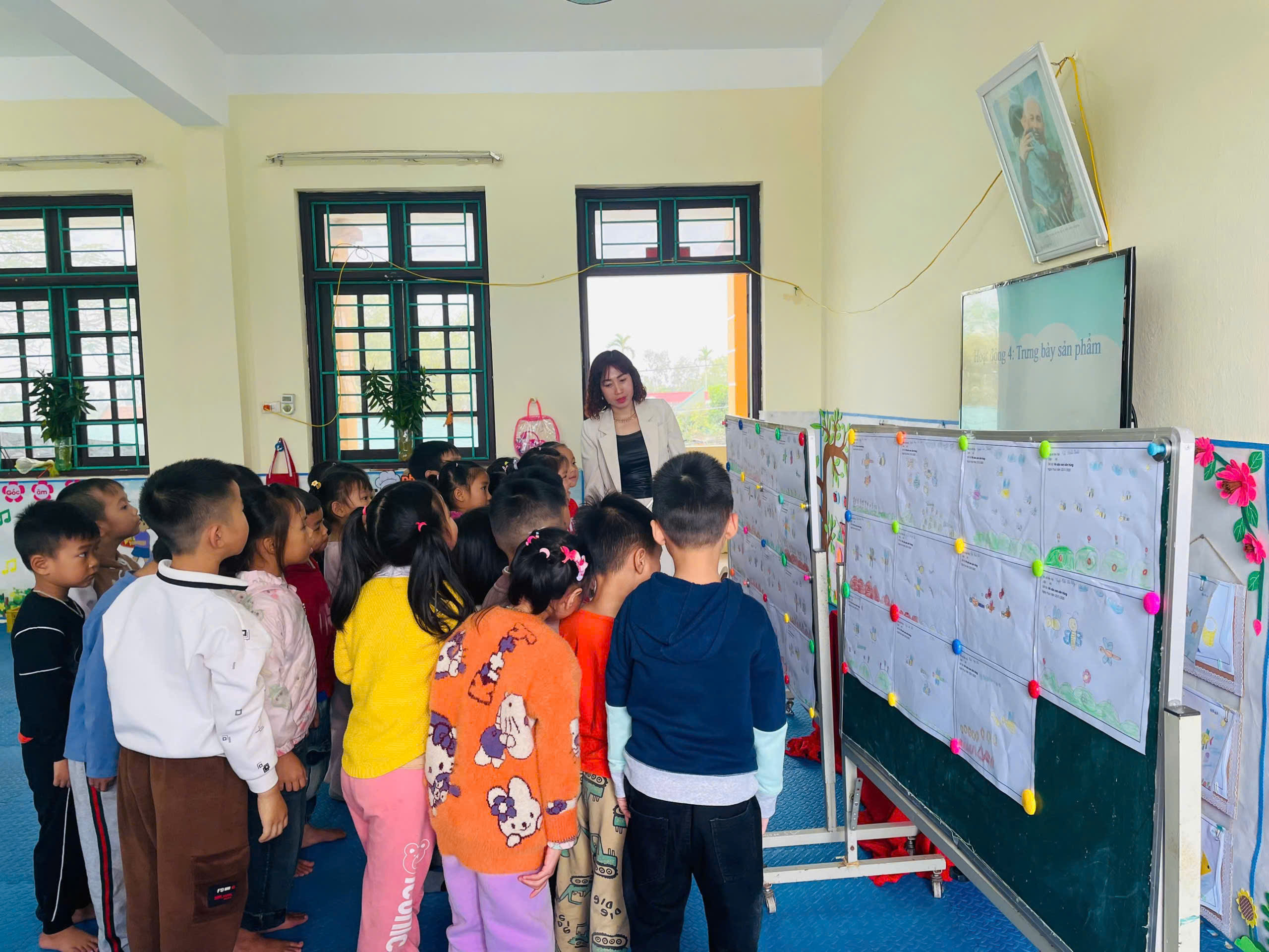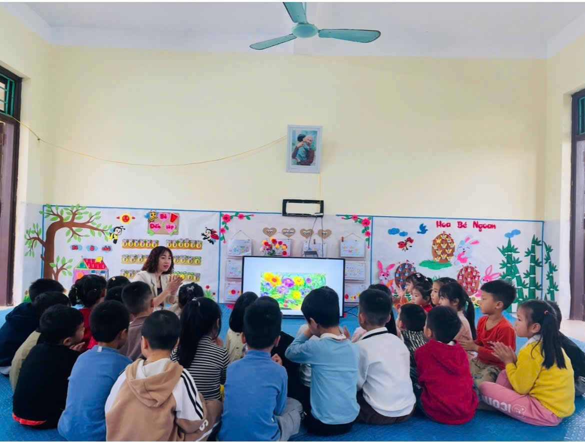 Trong quá trình thực hành, đồng chí Hiệu trưởng luôn gần gũi, động viên, khuyến khích trẻ tự do sáng tạo, lựa chọn màu sắc, cách thể hiện theo ý thích cá nhân. Không khí lớp học diễn ra nhẹ nhàng, vui tươi; mỗi sản phẩm của trẻ đều được trân trọng, góp phần nuôi dưỡng sự tự tin, óc thẩm mỹ và tình yêu đối với thiên nhiên.