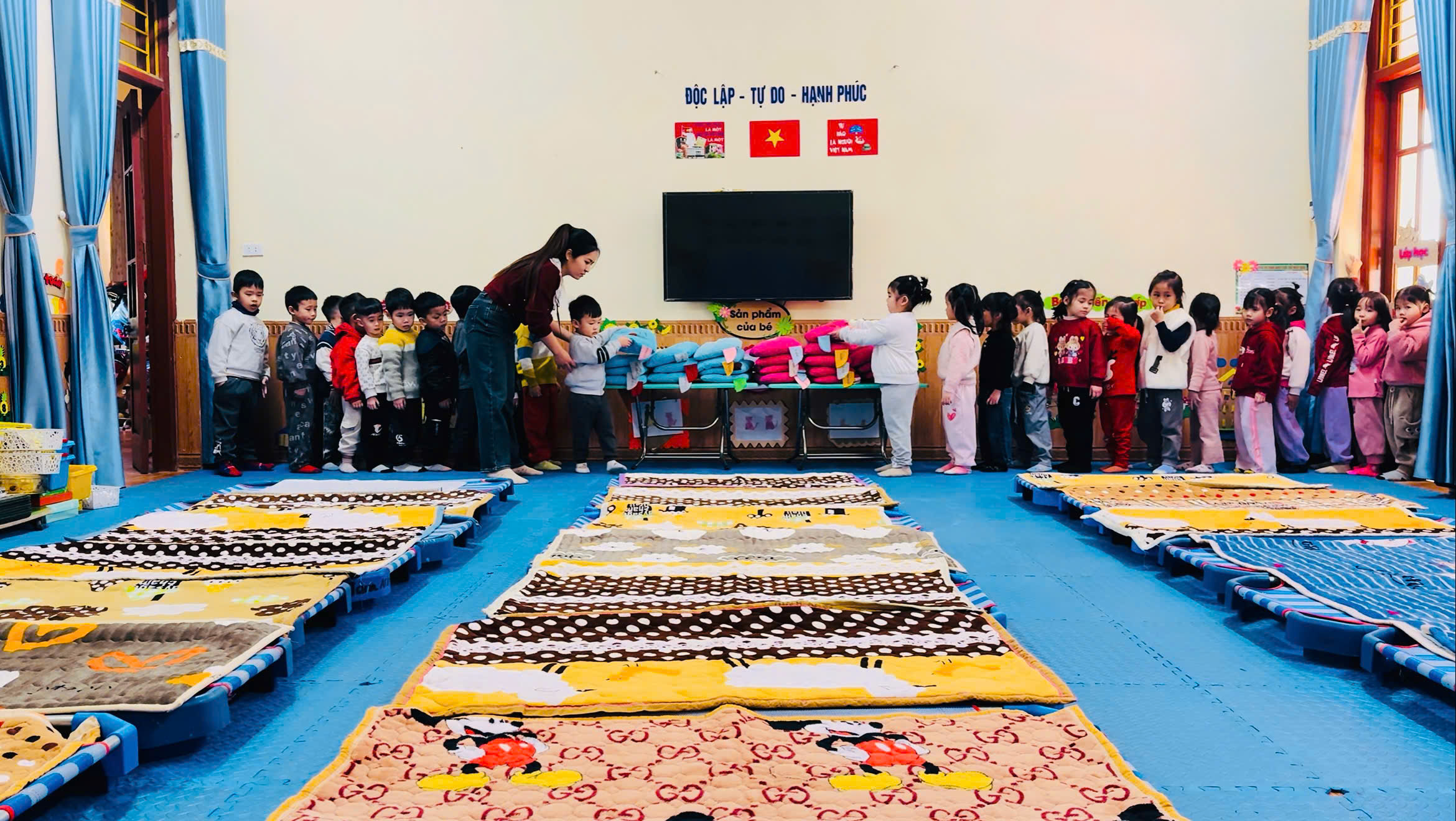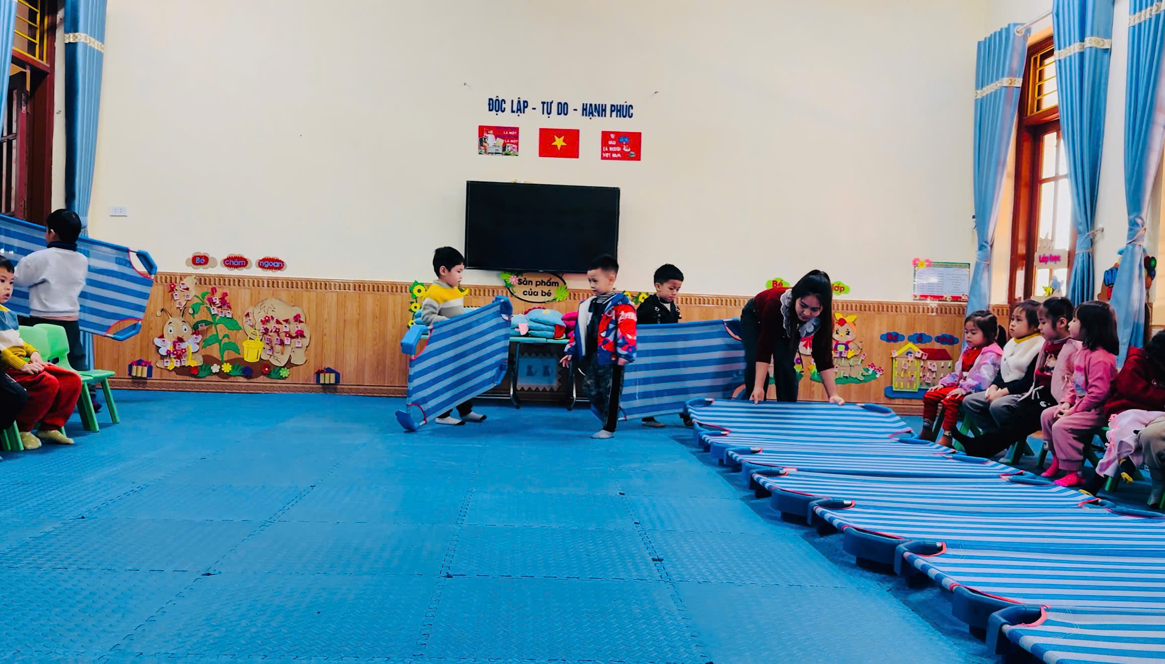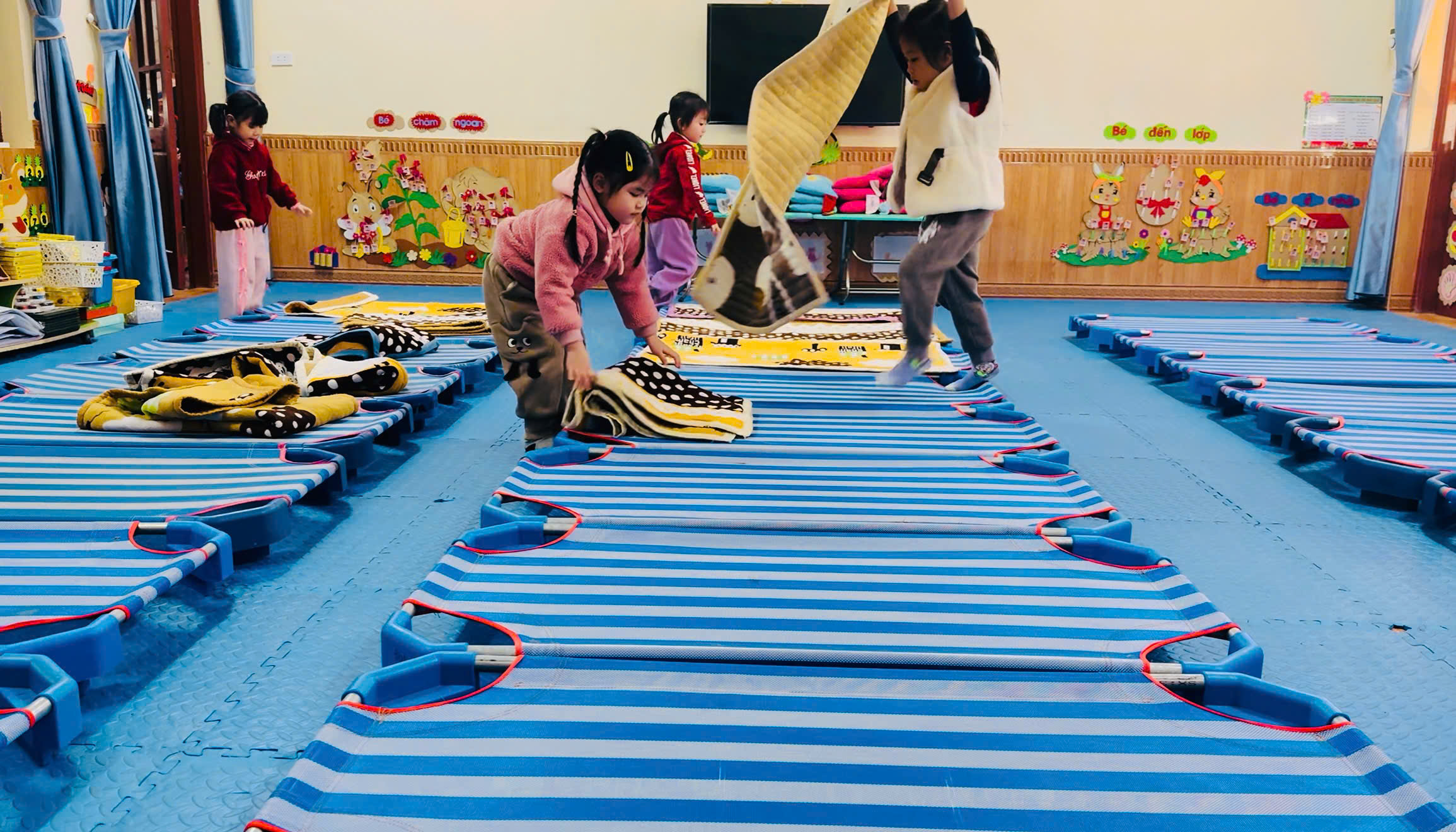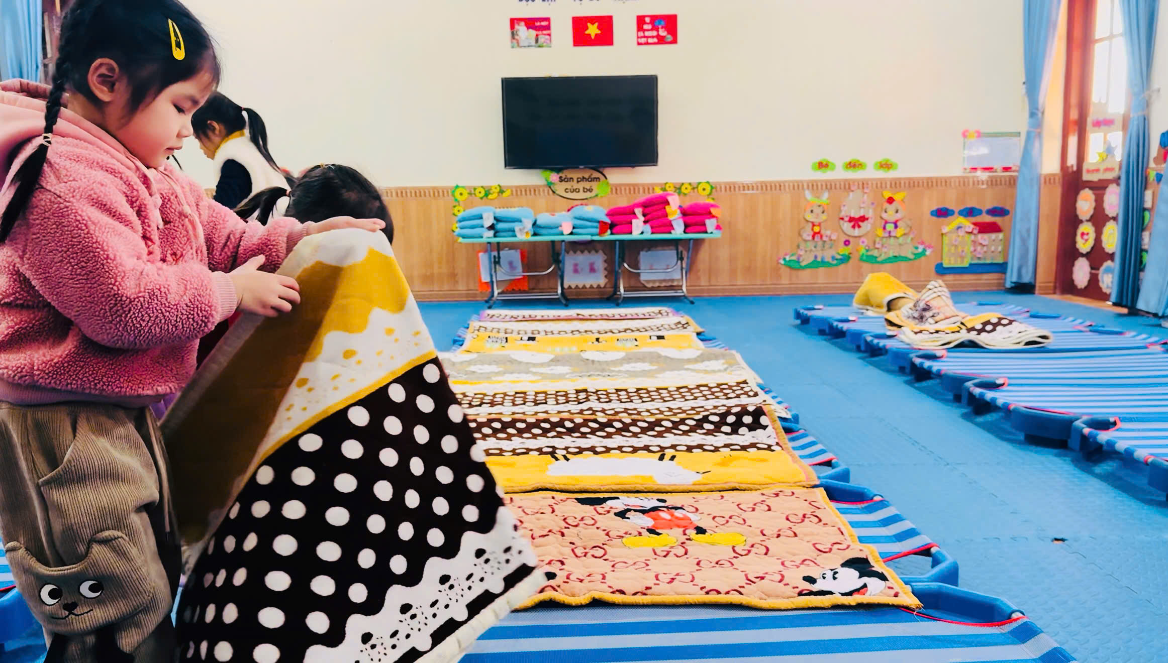 Hình ảnh trẻ giúp cô trải thảm ngủ