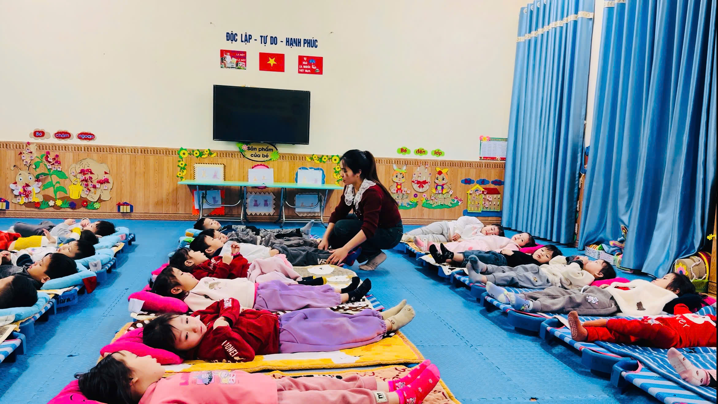 Trong quá trình trẻ ngủ, cô giáo luôn quan sát, kịp thời chỉnh lại tư thế nằm, đắp chăn cẩn thận cho từng trẻ, tạo cảm giác an toàn và thoải mái. Những gương mặt hồn nhiên, say giấc ngủ thể hiện sự tin tưởng, gắn bó giữa cô và trẻ.