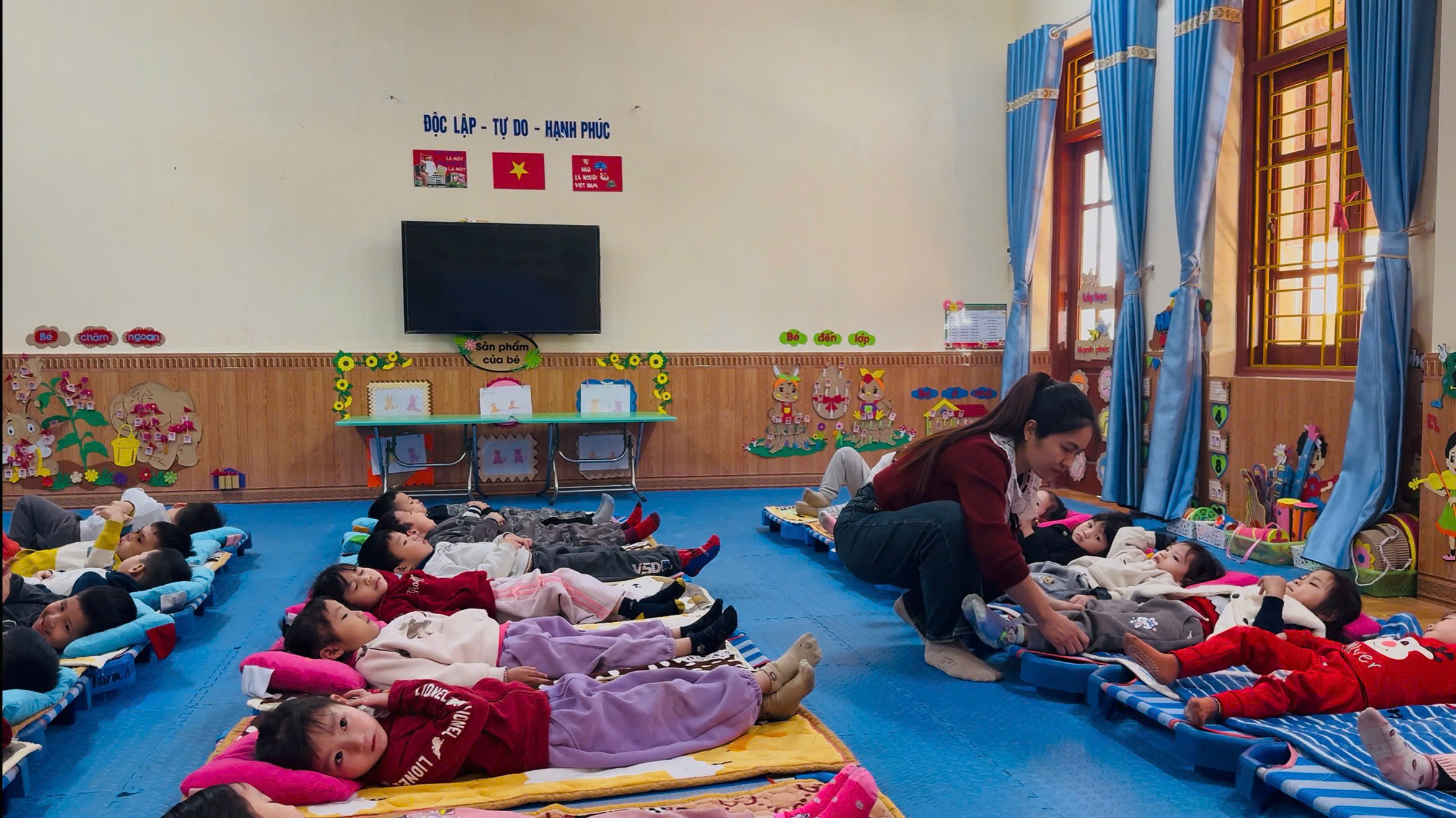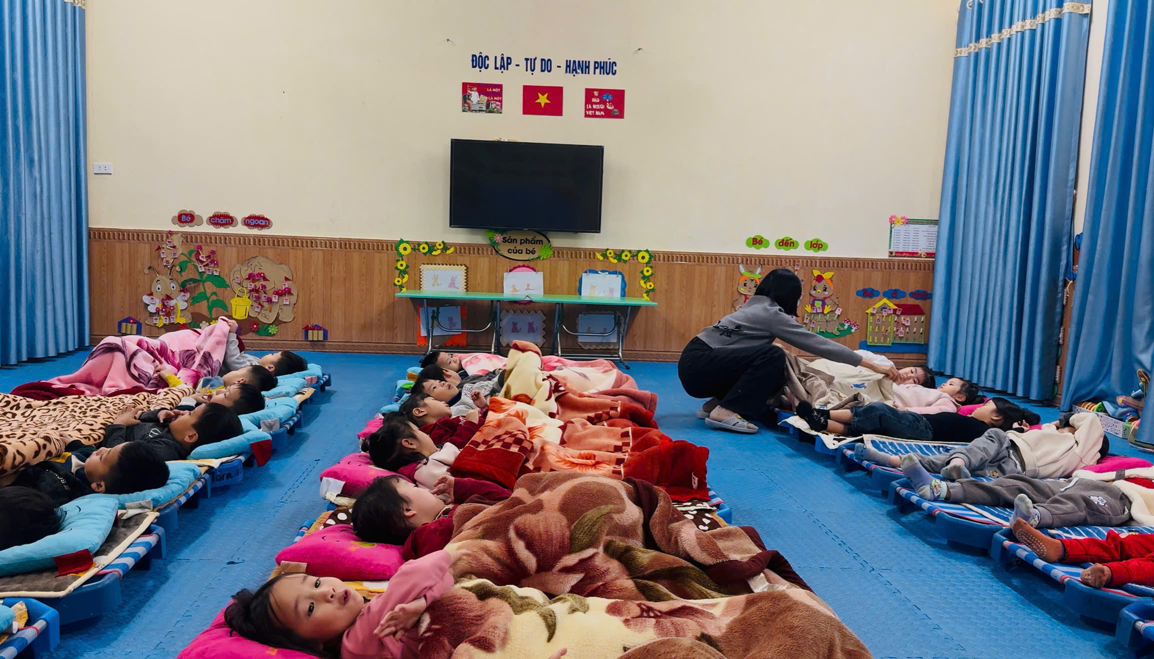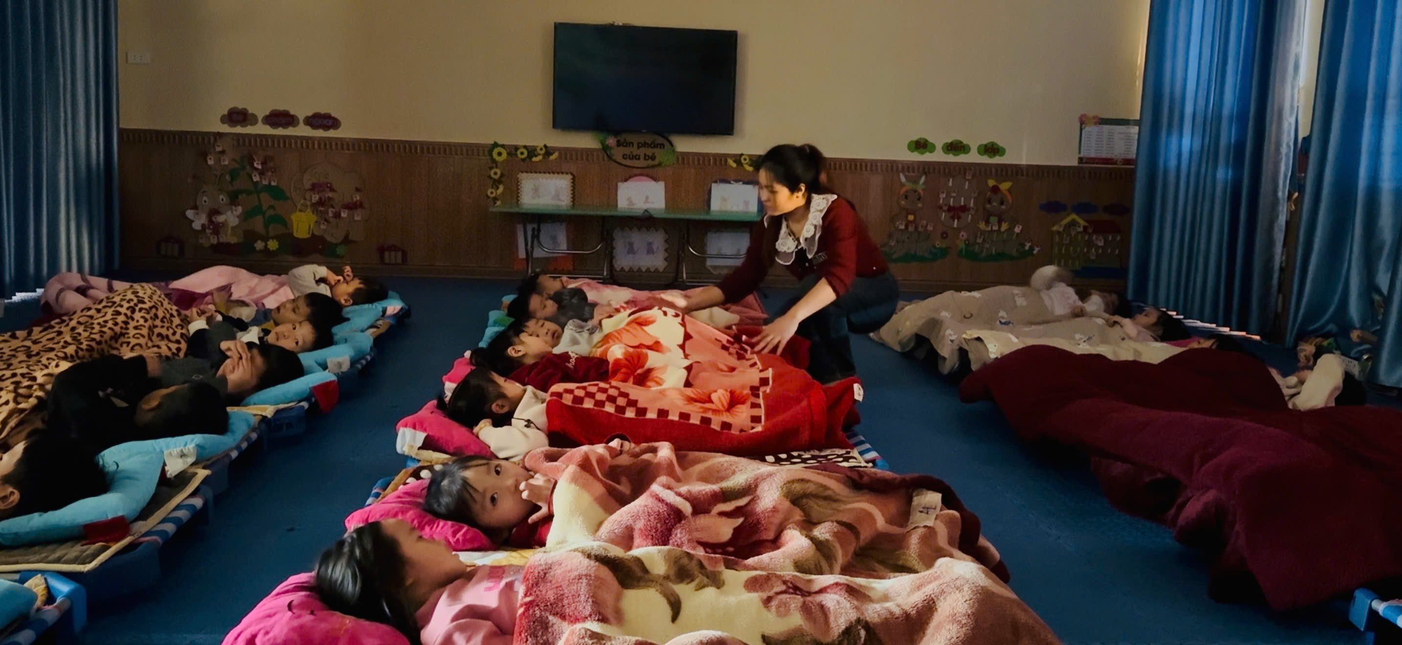 Trong quá trình trẻ ngủ, cô giáo luôn quan sát, kịp thời chỉnh lại tư thế nằm, đắp chăn cẩn thận cho từng trẻ, tạo cảm giác an toàn và thoải mái. Những gương mặt hồn nhiên, say giấc ngủ thể hiện sự tin tưởng, gắn bó giữa cô và trẻ.