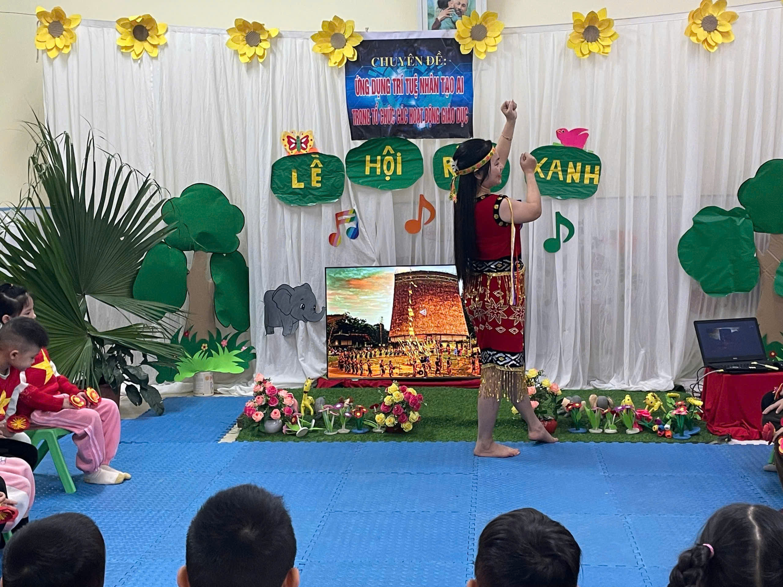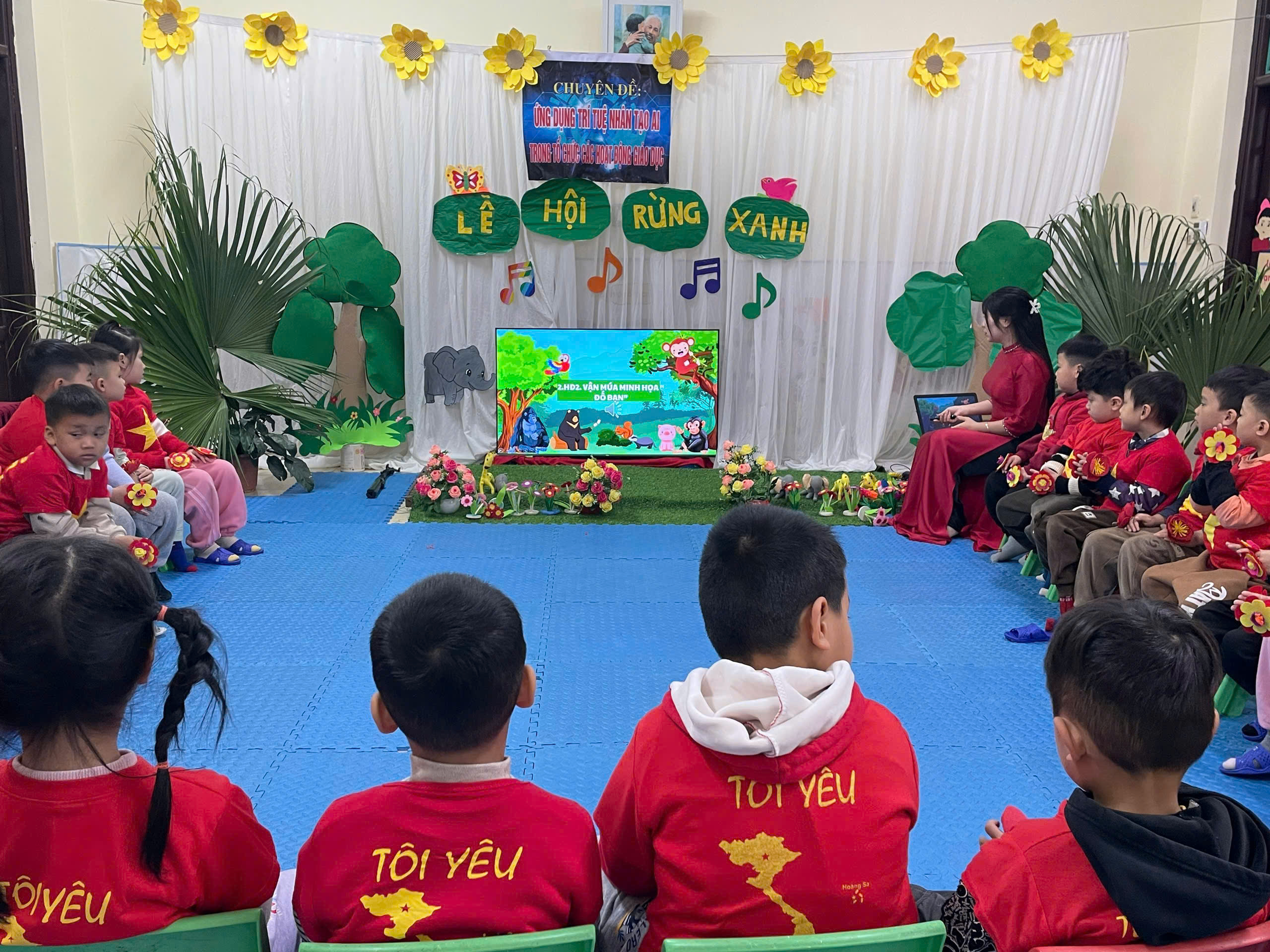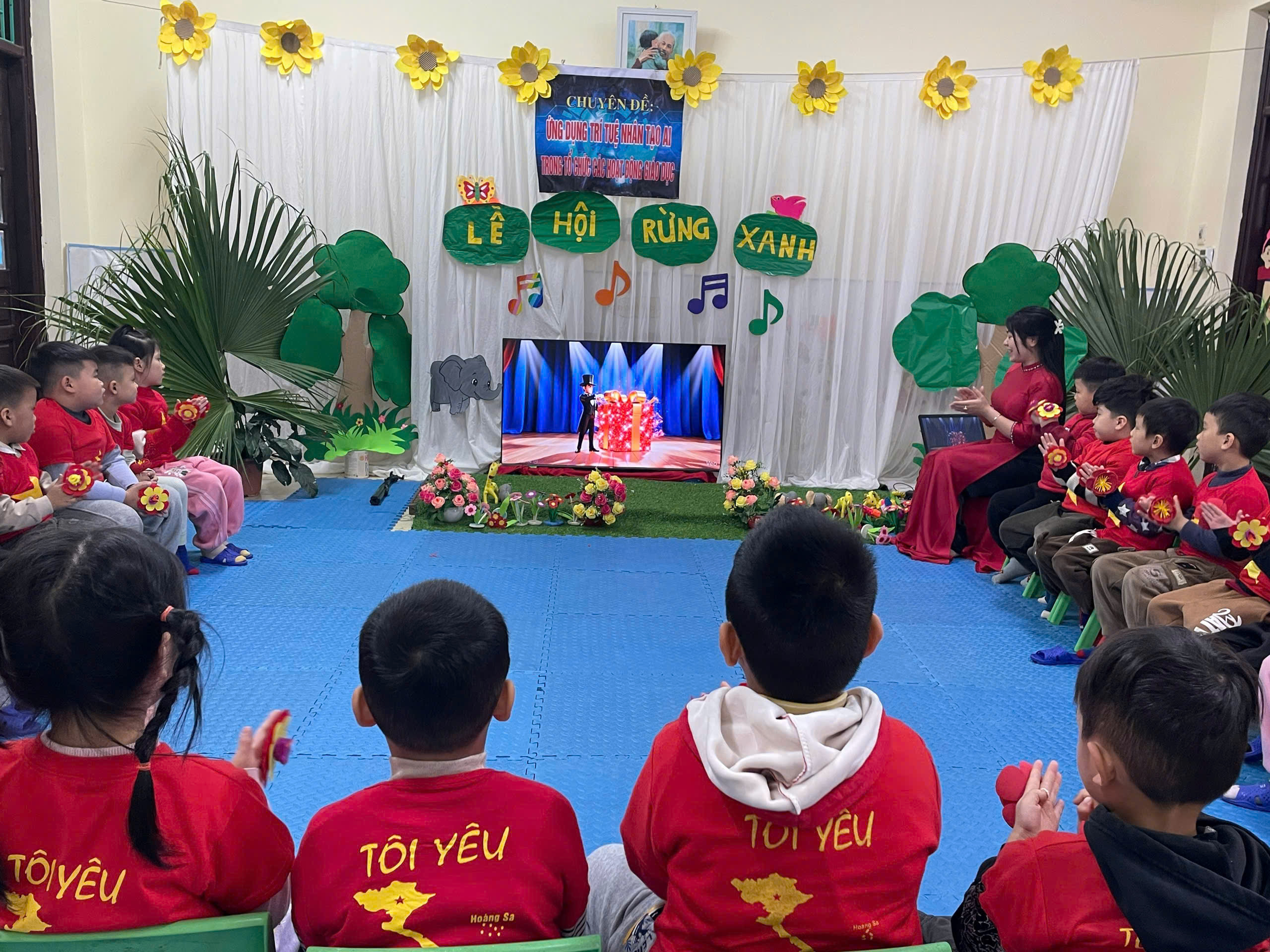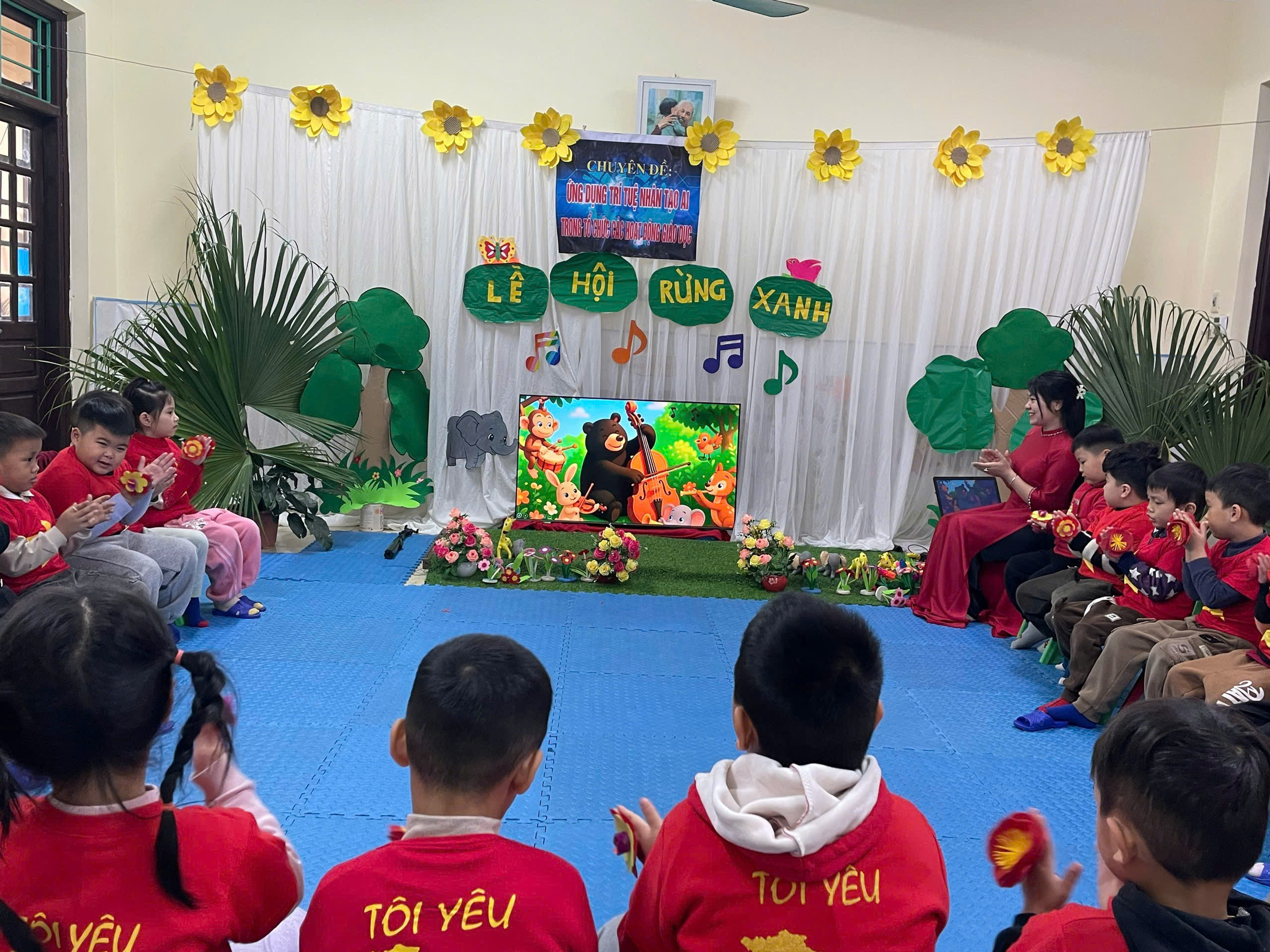 Trong tiết học, giáo viên đã lựa chọn và khai thác các tư liệu hỗ trợ từ AI như hình ảnh minh họa trực quan, gợi ý động tác vận động phù hợp, giúp trẻ dễ hiểu, dễ ghi nhớ và hứng thú tham gia. Nhờ đó, hoạt động âm nhạc diễn ra trong không khí vui tươi, sôi nổi; trẻ được hát đúng giai điệu, rõ lời, đồng thời thực hiện các động tác múa minh họa nhịp nhàng, tự tin.